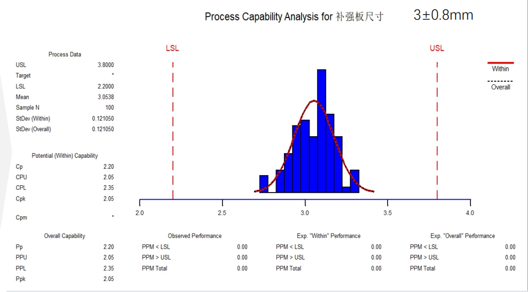 數(shù)據(jù)處理:USL 3.8,LSL 2.2,Mean3.0538,StDev(Within) 0.121050,StDev(Overall) 0.121050。